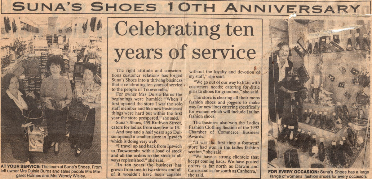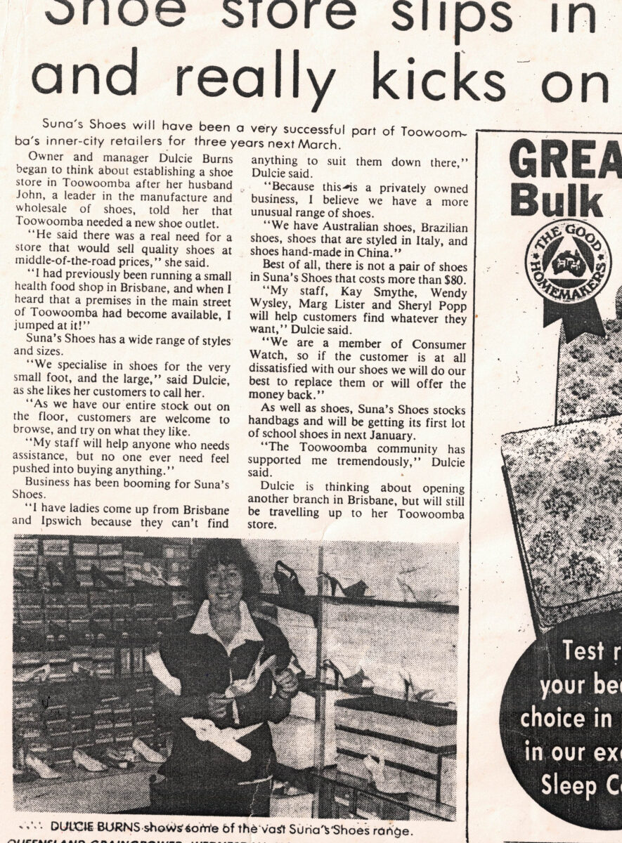Dulcie’s vision and determination propelled Suna Shoes to success in Toowoomba. Her story serves as an inspiring reminder of the power of perseverance, passion, and believing in oneself against all odds.