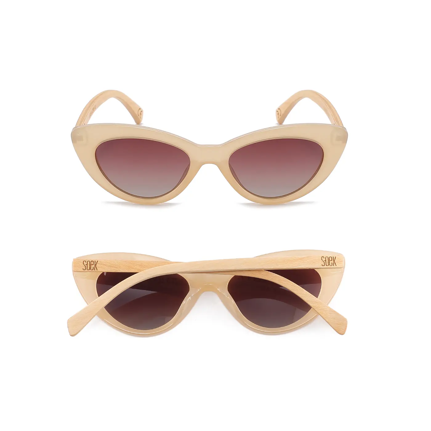 This is an iconic slim cat eye sunglass that never goes out of style. Favoured by style icons for generations, our Savannah is finished in a clear blush pink with walnut wood arms and fitted with gradient brown lenses.