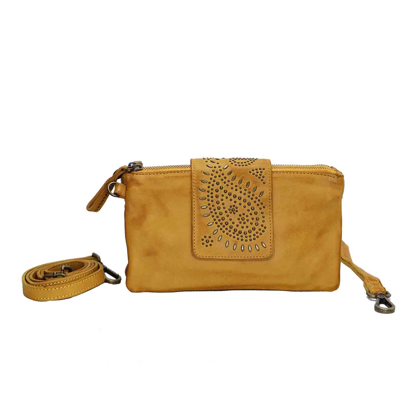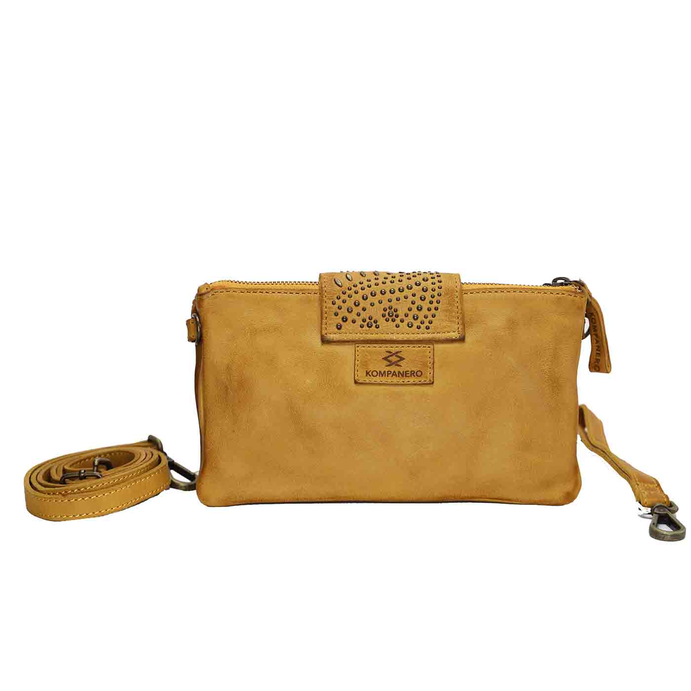 The perfect multi-pocket for daily use featuring 2 zipped compartments, NIA by Kompanero is everything you need in one stunning piece. Designed with a stud detailing front flap with a secure magnetic closure, your belongings remain safe and secure with no compromise on style. Inside, you’ll find a spot for your phone nestled in between two zip compartments, with space for 6 cards and a zipped coin pocket in the back, plus the option to wear as a crossbody or as a wristlet.