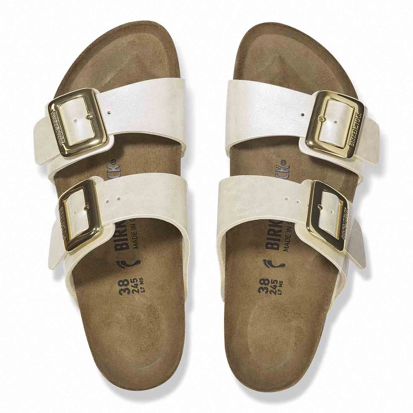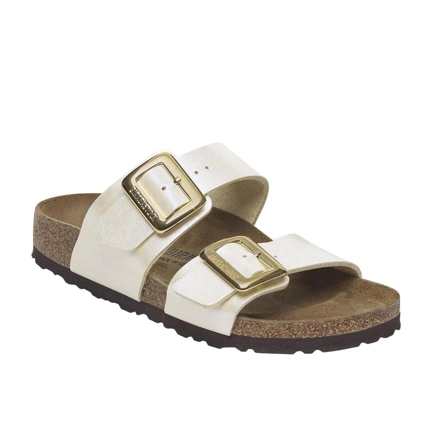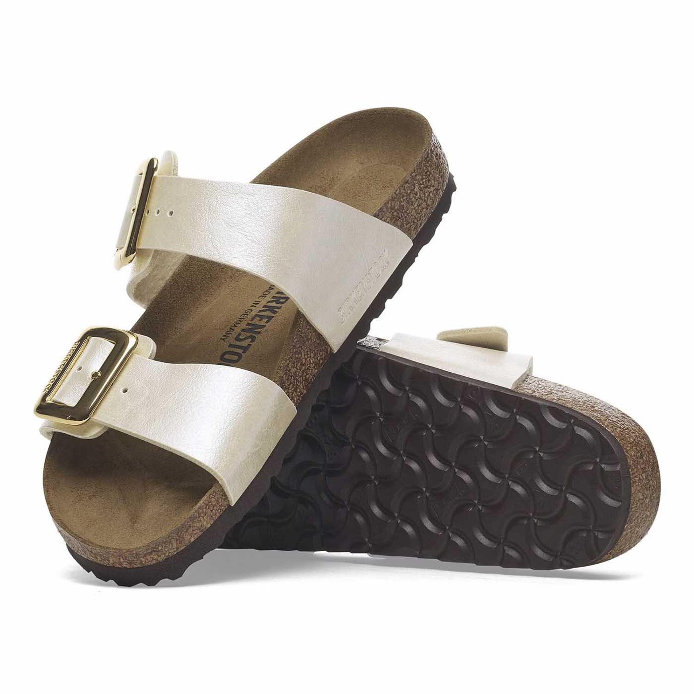 The Birkenstock Sydney proves that fashion and functionality can go hand in hand. With its two simple straps, it’s a real hit with women who want both high fashion and comfort. This sandal version has a silky sheen finish. The shiny, gently rounded padded buckles are especially eye-catching. The upper is made from the skin-friendly, hard-wearing synthetic material Birko-Flor.