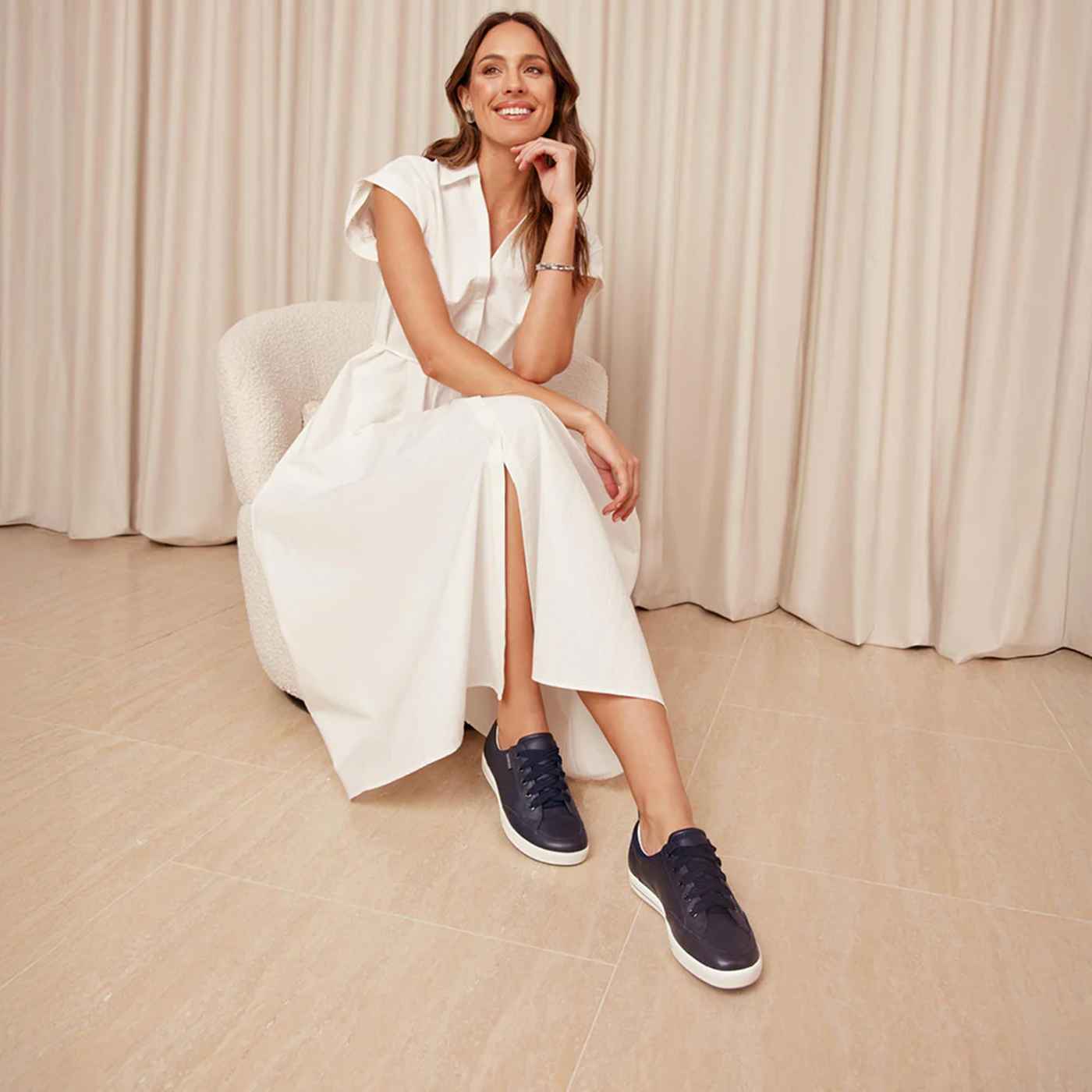 Upgrade your daily essentials with Ellie in always-classic Navy. This refreshed favourite maintains the same fit and feel you love but with a slightly softened toe for a contemporary touch. Featuring jacquard-weave ribbon laces and additional recycled cotton laces provided for versatile styling, Ellie is a mainstay with true versatility. With a triple-layer support and cushion system, custom fit options, and podiatrist-designed footbed technology, Ellie combines classic style with all-day comfort. Handcrafted leather and eye-catching sole details complete the look.