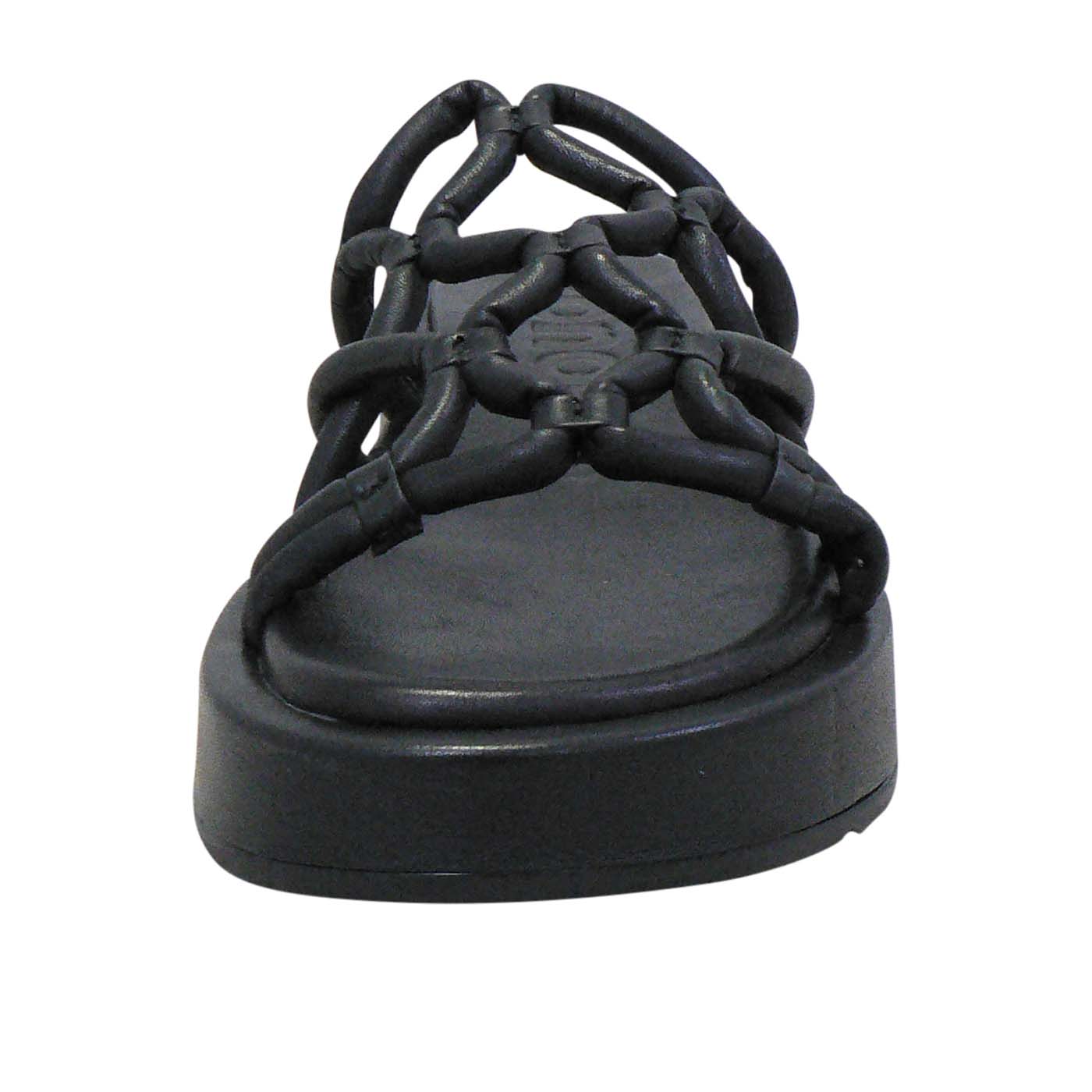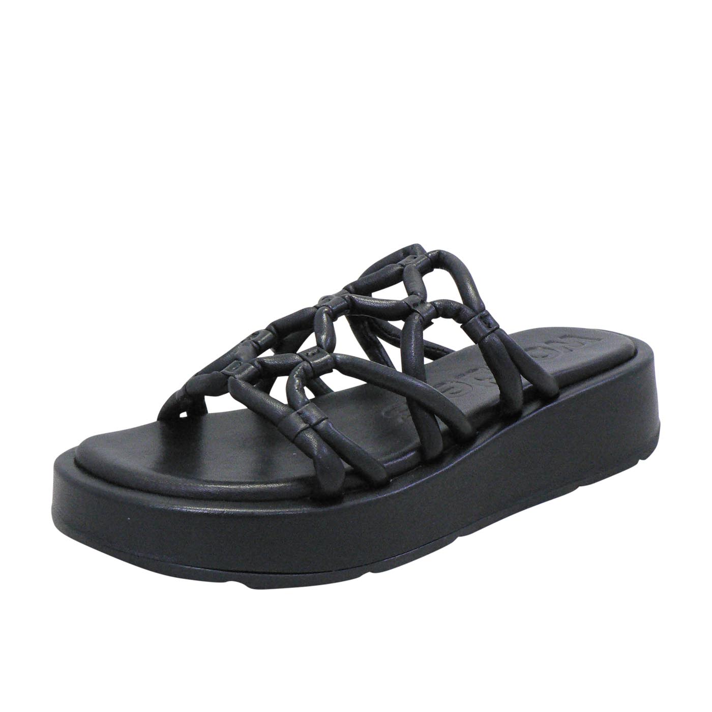 The Wonders Eladia sandal in black is a bold and contemporary choice, perfect for those who appreciate unique design with a modern edge. Featuring a leather upper, this sandal boasts an intricate network of braided straps that create a captivating, almost architectural look. The thick platform sole provides both height and comfort, making it ideal for all-day wear. Whether paired with casual summer outfits or more dressed-up ensembles, the Eladia sandal adds a touch of sophistication and a statement-making element to any wardrobe.